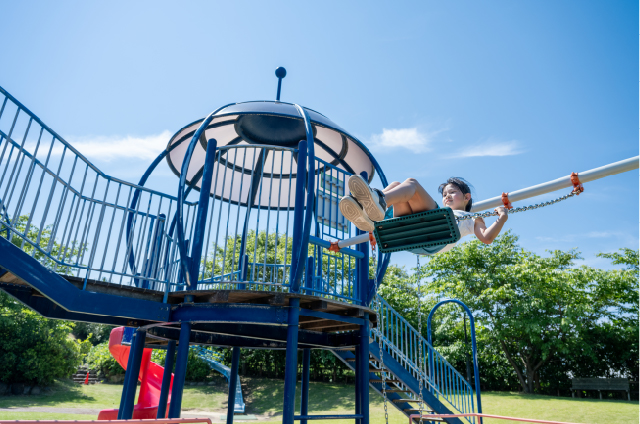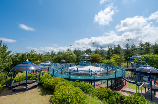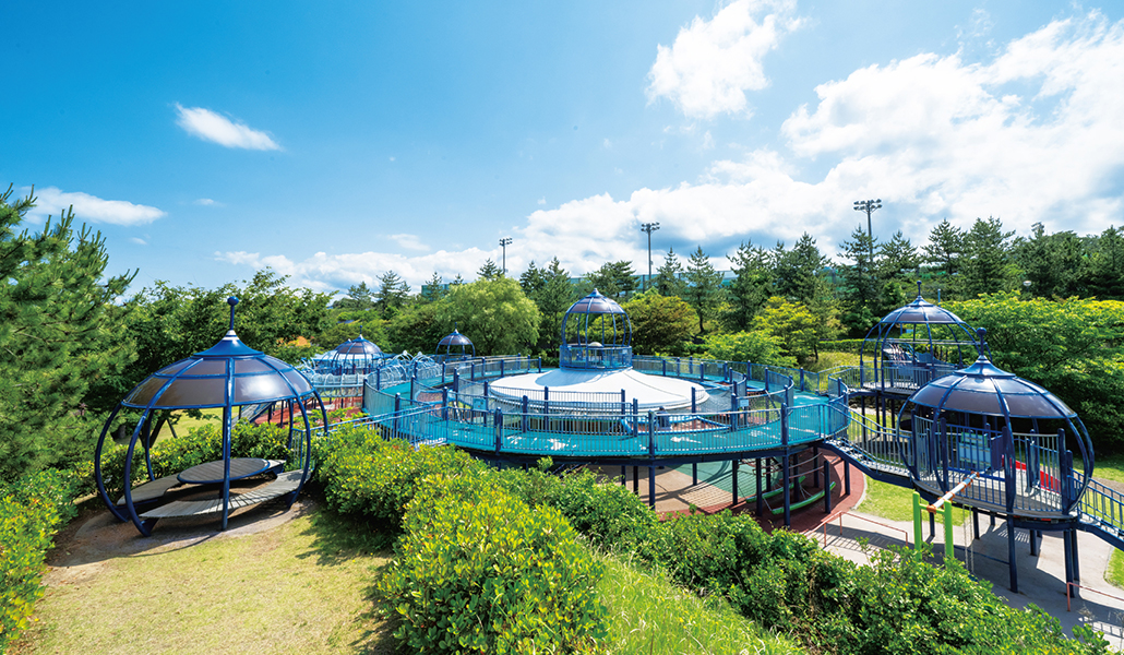 日本海を望む高台にある七塚中央公園では、設置から20年以上経った今も遊具が美しい状態を保っています。潮風や積雪といった厳しい環境にも耐え、地域のシンボルとして親しまれています。適切な素材選びと定期的なメンテナンスが、長く安心して使える遊具を支えています。