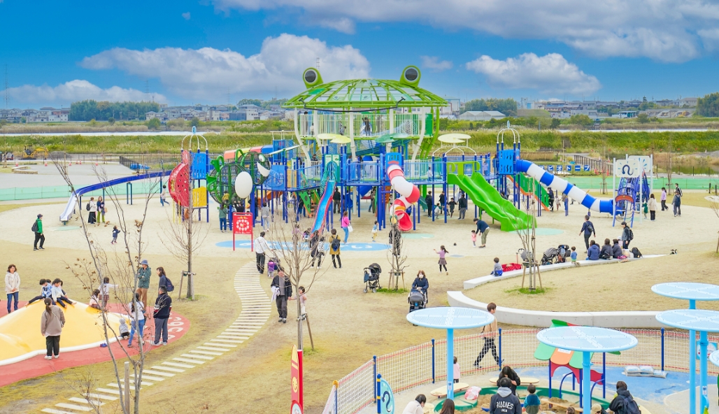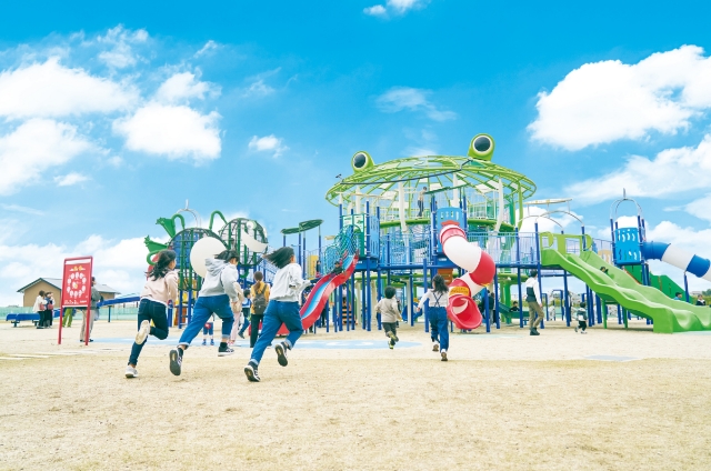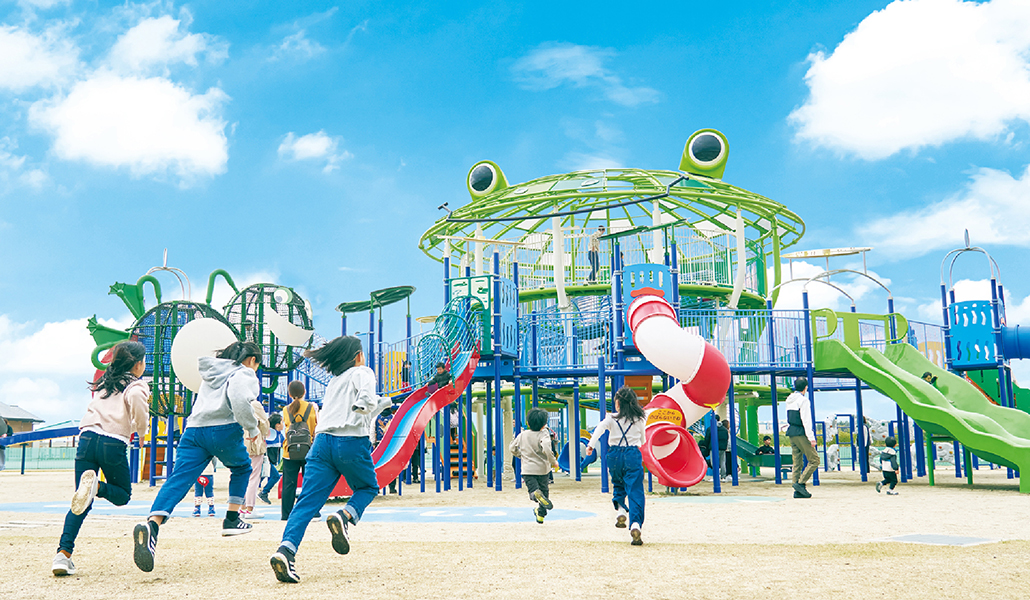 乳児・幼児・児童向けの多彩な遊具に加え、音の鳴る遊具やハンモック型ブランコなど、誰もが楽しめるインクルーシブな空間を実現しました。大型のカエルタワーは、隣接する国道や市民病院からも望むことができ、公園の新たなシンボルとして親しまれています。“だれもが安心して遊べるあそび場”づくりを目指す、そんな想いが形になった事例です。
