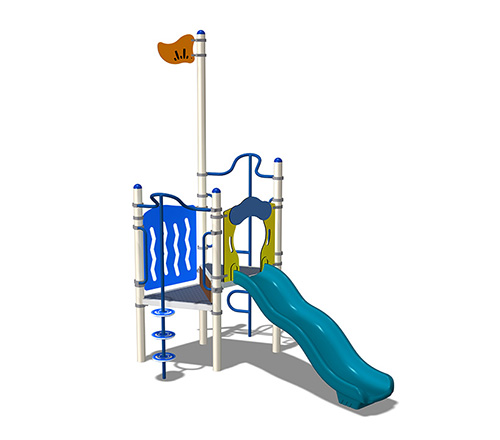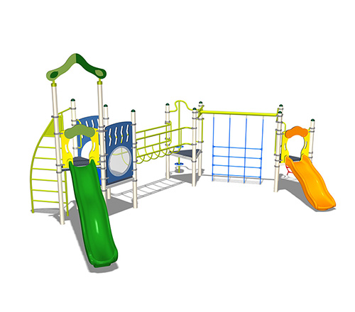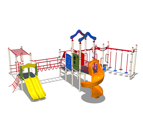 どんなスペースにも合わせやすい、ベーシックデザインの児童用複合遊具。カラフルなデザインが目を惹く公園のシンボルとなる遊具です。