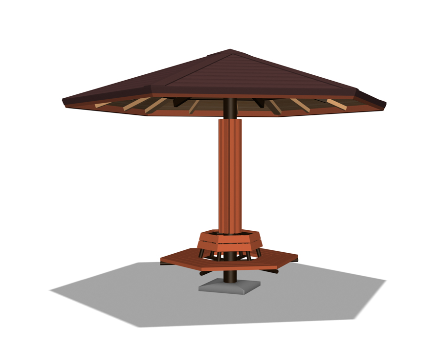 支柱:スチール(電気亜鉛メッキ処理・ウレタン樹脂塗装仕上げ) 屋根:ガルバリウム鋼板葺 柱化粧材:オレンジウッド材(合成木材) 座板:オレンジウッド材(合成木材) |